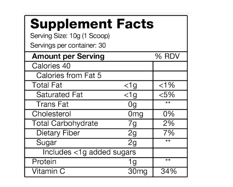 Hierba de Cebada Orgánica, Maltodextrina resistente a la Digestión, Betaglucano de Avena, Lecitina de Soja, Saborizante Natural, Hierba de Trigo Orgánica, Acido Cítrico, Clorela Orgánica, Zanahoria Orgánica, Espirulina Orgánica, Extracto de Té Verde, Sílice, Manzana Verde, Extracto de Baya de Acerola, Mango, Extracto de Stevia, Limón, Granada, Mezcla de Enzimas Digestivas (Amilasas, Lactasa, Proteasas, Lipasa, Celulasa), Rutina, Quercetina, Acido Alfa Lipoico, Aloe Vera 200X, Extracto de Arándano, Extracto de Cardo Mariano, Extracto de Alcachofa, Extracto de Semilla de Uva, Corteza de Pino Extracto, Extracto de Saúco, Hongo Melena de León, Hongo Cola de Pavo, Hongo Chaga, Hongo Maitake, Luteína, Licopeno, Trans-Resveratrol.