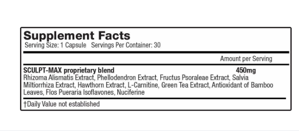Mezcla patentada SCULPT-MAX: Extracto de Rhizoma Alismatis, Extracto de Felodendro, Extracto de Fructus Psoraleae, Extracto de Salvia Miltiorrhiza, Extracto de Espino, L-Carnitina, Extracto de Té Verde, Antioxidante de Hojas de Bambú, Isoflavonas de Flos Pueraria, Nuciferina.