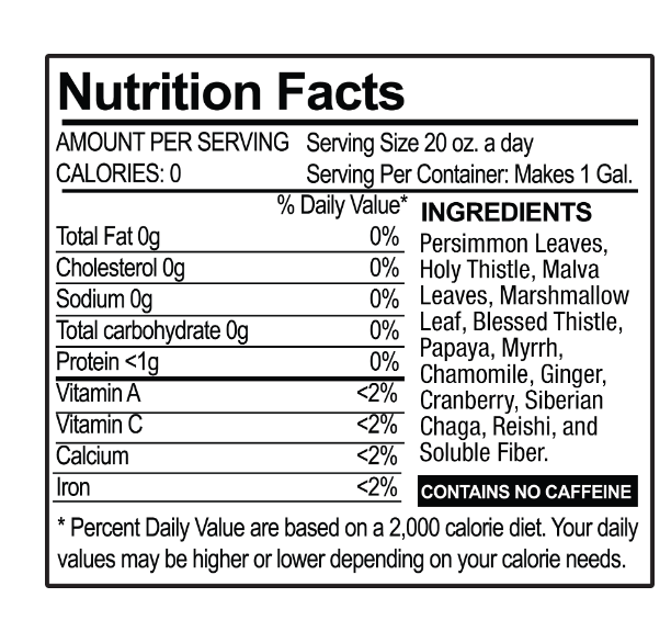 Hojas de Caqui, Cardo santo, Hojas de Malva, Hojas de Malvavisco, Cardo Bendito, Papaya, Mirra, Manzanilla, Jengibre, Arándano, Chaga Siberiano, Reishi y Fibra Soluble.